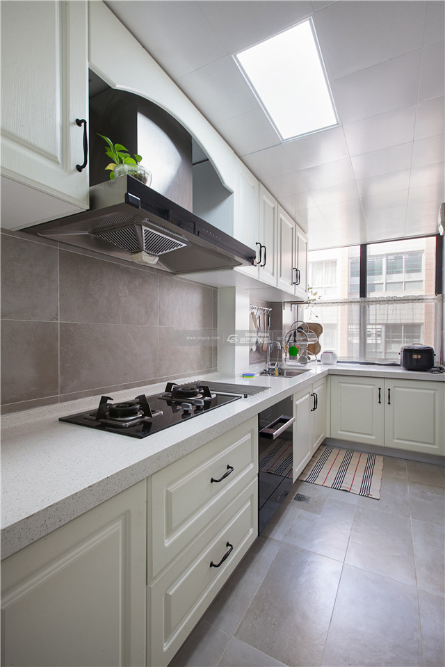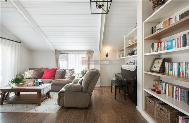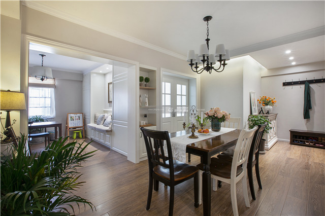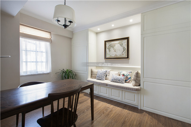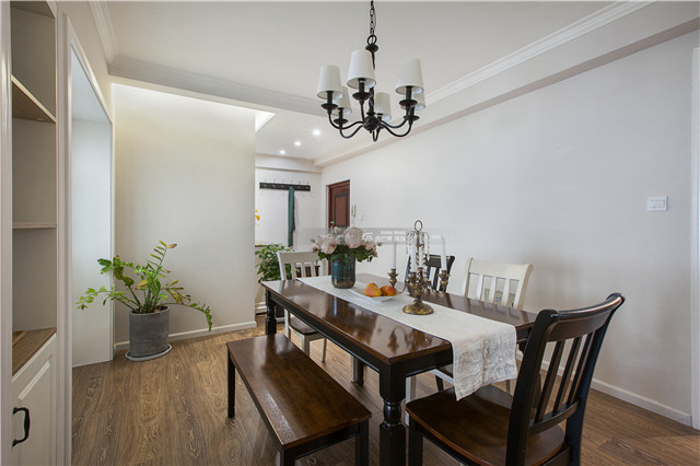 簡潔明亮的配色清爽明快,深色木地板突出質樸、優雅的感覺。美式的燈具增加濃厚的美式氛圍。