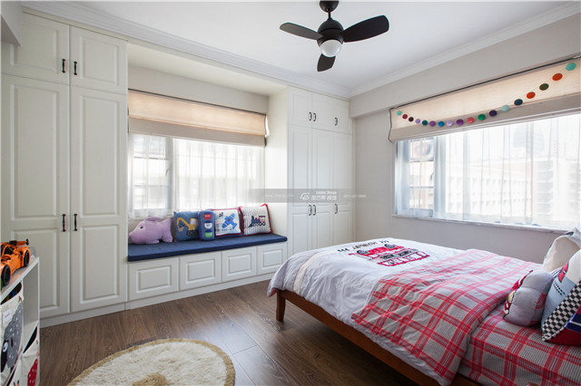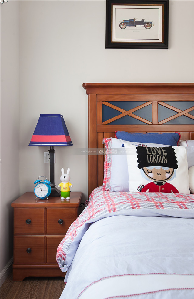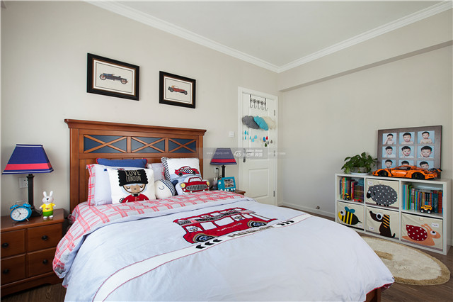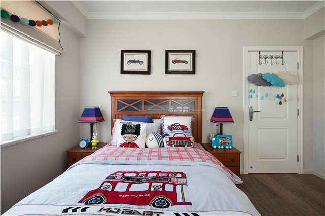 細節感滿滿的設計滿足整體風格的調性,可愛的卡通裝飾,富有美式氣息的床具、紅藍顏色搭配,讓孩子的小天地變得個性十足,溫馨感滿滿。