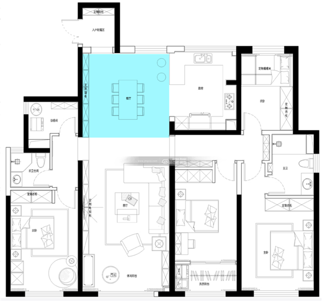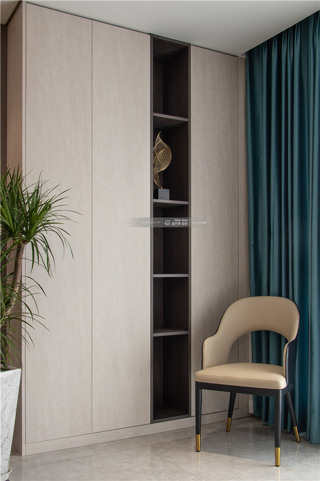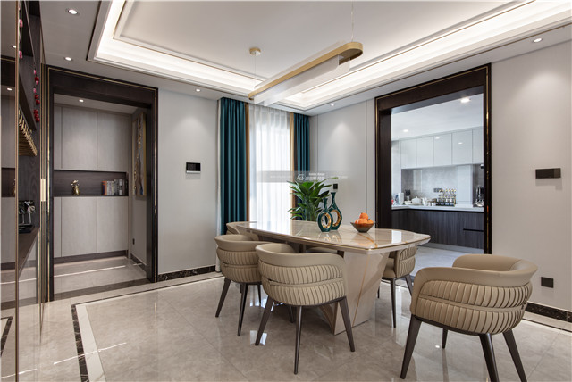 吊頂增加金色線條,隨處可見的輕奢感,豐富的材質(zhì)讓屋子變得富有內(nèi)涵、有韻味。