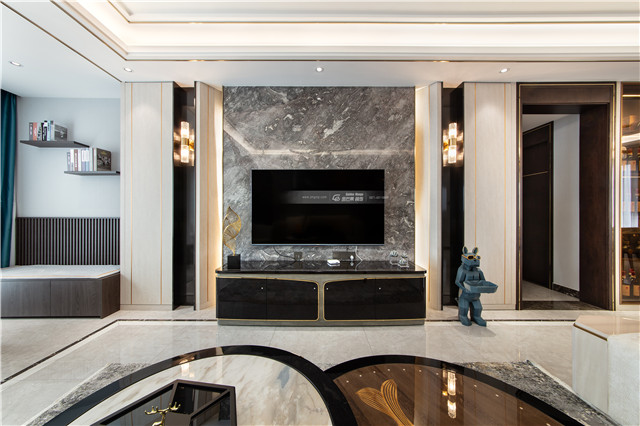 大理石電視背景墻結合兩邊的燈帶,營造輕奢的品質(zhì)感,讓背景墻層次更豐富。
