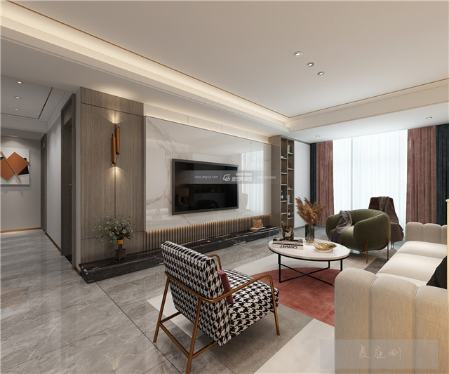 簡潔的象牙白,大理石電視背景墻,品質感滿溢的空間氣質,既有格調又溫暖溫馨,木材的運用增加溫暖溫馨感。