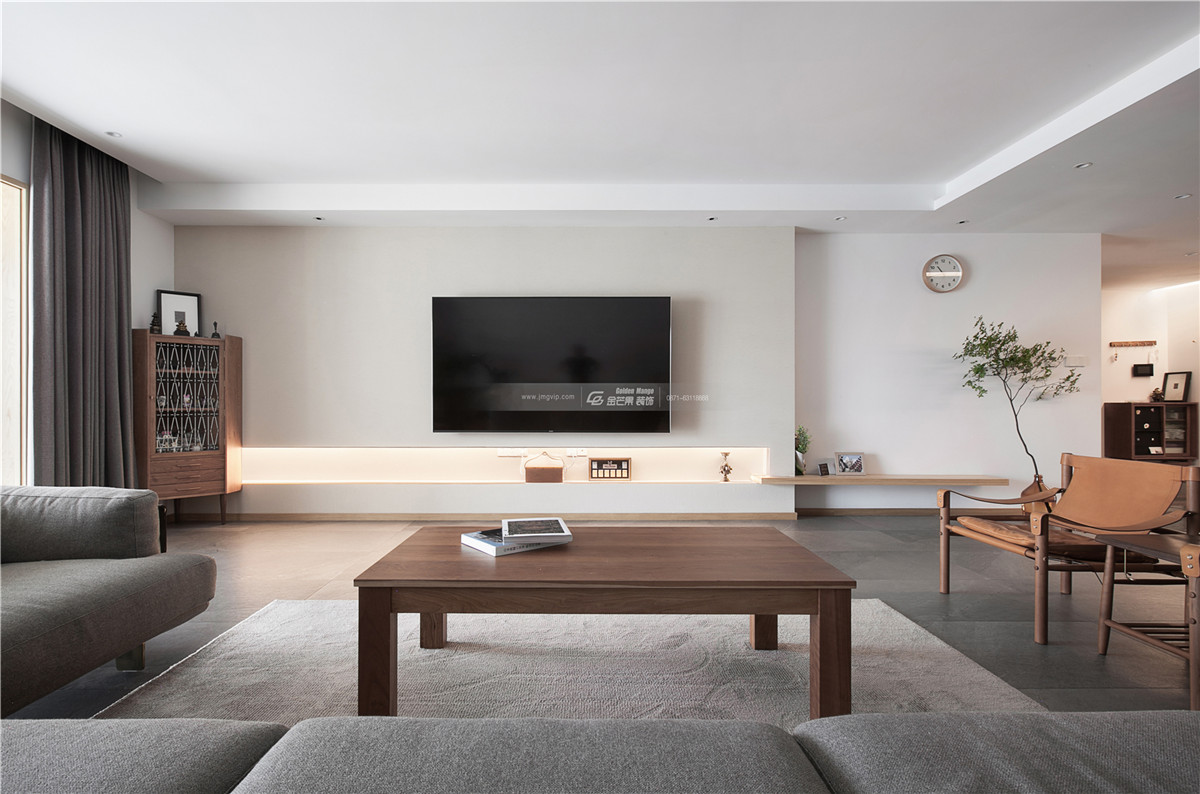 簡潔的電視背景墻,摒棄過多的物化堆砌,給予家居的每一縷草木最肆意暫放的姿態。脫離世俗的淡泊與寧靜讓人心安。