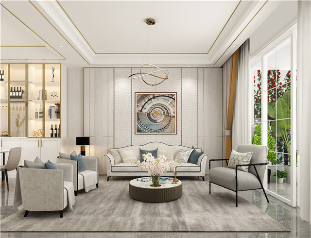 客廳給人的感覺非常時尚氣派但是又不會過度奢華,整體色調是以白灰為主再加入一些香檳色的線條設計,華麗之余不會讓人產生過多的疏離感,溫馨舒適。簡約精致的燈飾,注入個性精致的氣息。沙發和茶幾互相呼應,茶幾上再擺放一束鮮花,活躍氣氛又花香撲鼻。