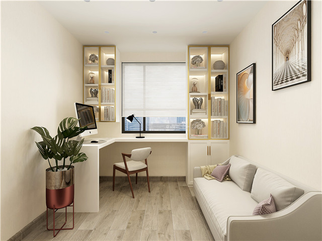 書柜書桌一體化,開放式和封閉式柜子相結合,讓空間不顯擁擠,反而讓人眼前一亮。搭配棉麻沙發,慵懶愜意。