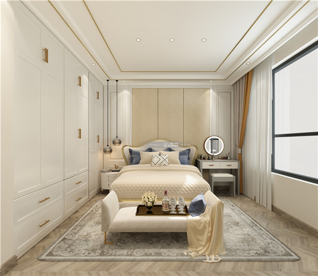 墻面的造型品質感滿滿,一門到頂的簡約衣柜,門板搭配香檳金把手,溫暖舒適的同時又不失高檔大氣。