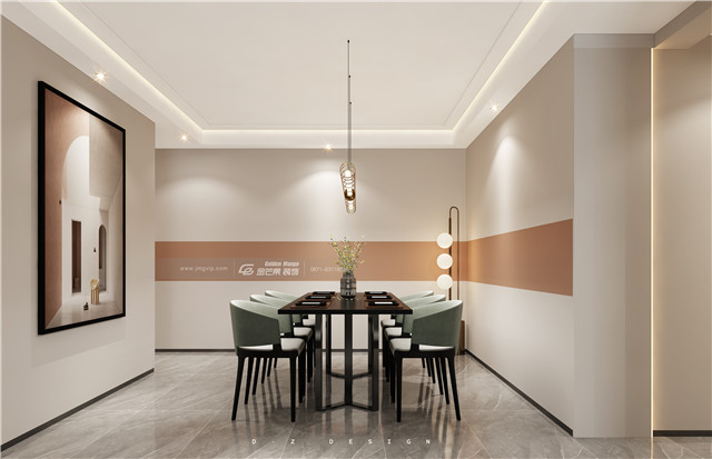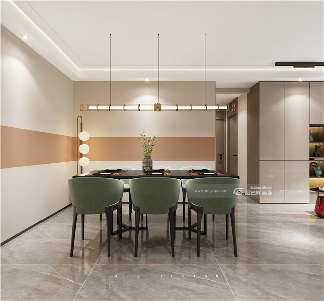 溫暖優雅的撞色充滿家居的溫柔時尚感,簡約的墻面穿插上溫柔的粉色,個性、格調立現,讓家呈現可鹽可甜的氛圍,優雅的綠色餐桌極具時尚感,和粉色搭配既溫柔又個性高級,又兼具現代的時尚家居感。