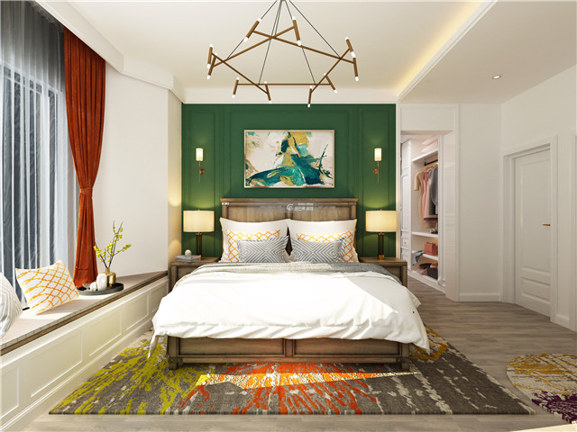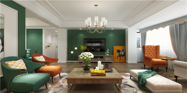 綠色的電視背景墻充滿個(gè)性,美式家居摩登中的復(fù)古最是迷人,彰顯奢華的高級(jí)感。