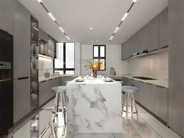 柜體設(shè)計(jì),家電合理嵌入,在材質(zhì)搭配下彰顯品質(zhì),再加上島臺(tái)操作方便,多人聚餐,美觀實(shí)用。