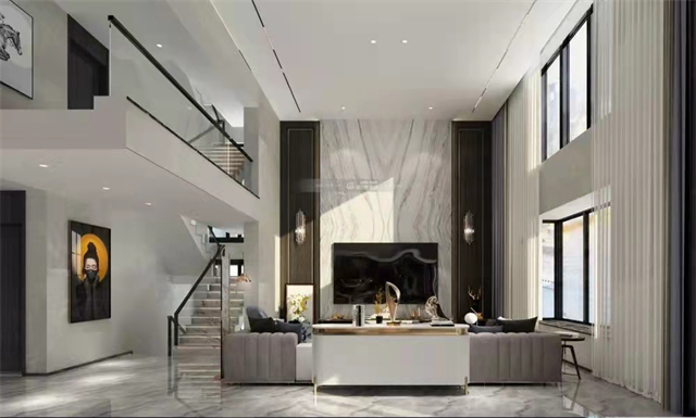 地面大理石材與電視背景石材墻板相呼映,大氣又不清冷,兩層樓梯石材踏步透明玻璃不銹鋼條,簡(jiǎn)潔又利落。