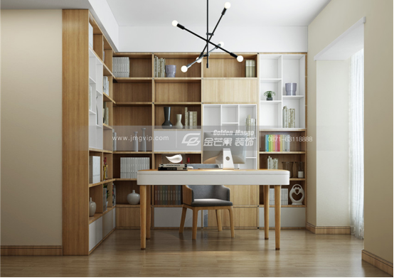 整體顏色主要采用原木色為主,柜子是定制的,以多個格子隔開,分類上更加清晰明了,書房最大的亮點(diǎn)是落地窗,不僅提高整個空間的顏值,也提供了更好的采光性