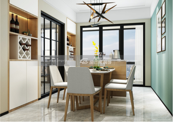 餐廳背景墻和吊燈都是同客廳的來做,在餐廳布局方面融入了吧臺設(shè)計(jì),致使空間功能上使用率更高。