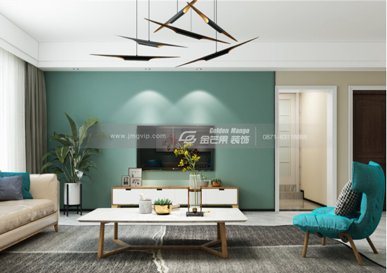 客廳整個空間主要以電視背景墻與沙發(fā)背景墻的顏色相呼應(yīng),獨(dú)特的吊燈設(shè)計(jì)有著很強(qiáng)空間穿透力,以及簡單的沙發(fā)和茶幾布置,再加上使用淺灰色的地磚,使得整個空間的色彩搭配達(dá)到極致,提升整個客廳空間的顏值。