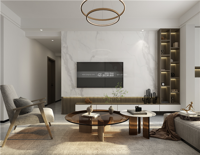 簡潔干凈的顏色,淡淡的大理石花紋,營造簡約、干凈而頗有意境的氣氛。電視柜和一旁的收納柜結合在一起,既個性又實用大方。玻璃臺面的茶幾,為客廳空間增加了許多精致的味道。