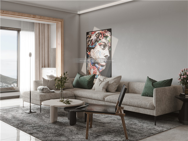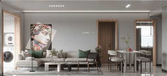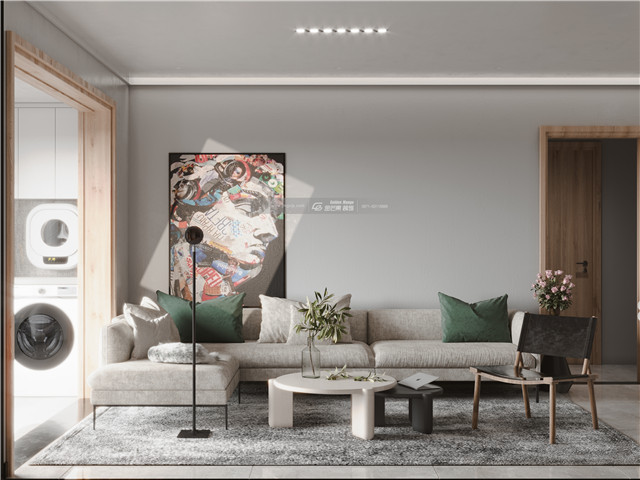 簡約的灰色,不同層次的鋪展開來,醞釀高級而豐富的層次。墻面的灰度讓空間變得富有高級感,灰色地毯承載溫厚的空間溫度感,棉麻的沙發讓空間變得更加文藝和細膩。