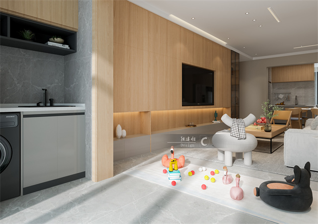 原木色電視背景墻,隱形的柜體一體式設(shè)計(jì),干凈利落,加之電視位置的視覺調(diào)節(jié)、可愛簡潔的家具、溫柔的配色,溫馨又舒適。