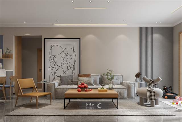 在整體風(fēng)格走向上,加入穩(wěn)重的灰色,不同深淺不同材質(zhì),既有碰撞區(qū)分又協(xié)調(diào)統(tǒng)一,空間感更好。