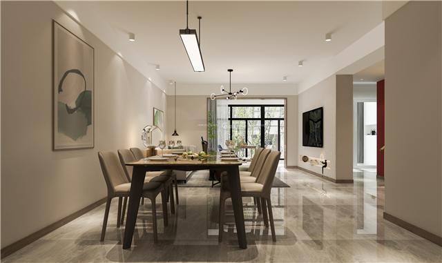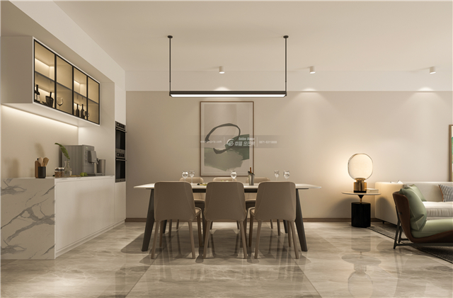 細膩溫柔的空間,家居氛圍也變得曖昧而生動起來。精致的餐邊柜以玻璃和黑色邊框作為點綴,大理石臺面提升空間的高級格調(diào)感。