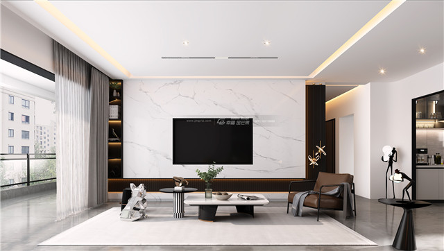 簡潔的線條,利落的顏色,黑白灰在這里得到了美好的展現,陽光輕輕,風也溫柔,清寧而肆意的美好。無主燈設計營造氛圍感,大理石電視背景墻和灰色地磚,清新又利落的家居氣質。