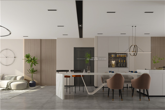 將餐桌和吧臺結合在一起,空間更具造型感。中間設置島臺,同時滿足中西廚烹飪需求。精致的大理石臺面提升空間氣質感,在清爽簡潔的氛圍下更顯干凈利落。
