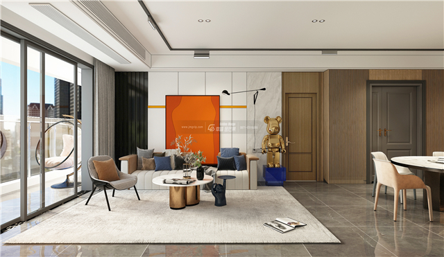 整體是簡約大方的格調,明媚的家居氛圍讓家變得溫暖無比。期間點綴的金屬、金色讓家多了一些華麗浪漫的氣息。簡約的金屬茶幾多了很多簡約精致的家具氛圍。沙發背景墻上的橙色裝飾畫,瞬間讓整個空間亮了起來。