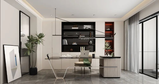 書房整體以高級白奠定空間的主基調,線條感極強的內飾尤其注重了實用性和功能性,定制的特色書桌豐富了整個空間的質感