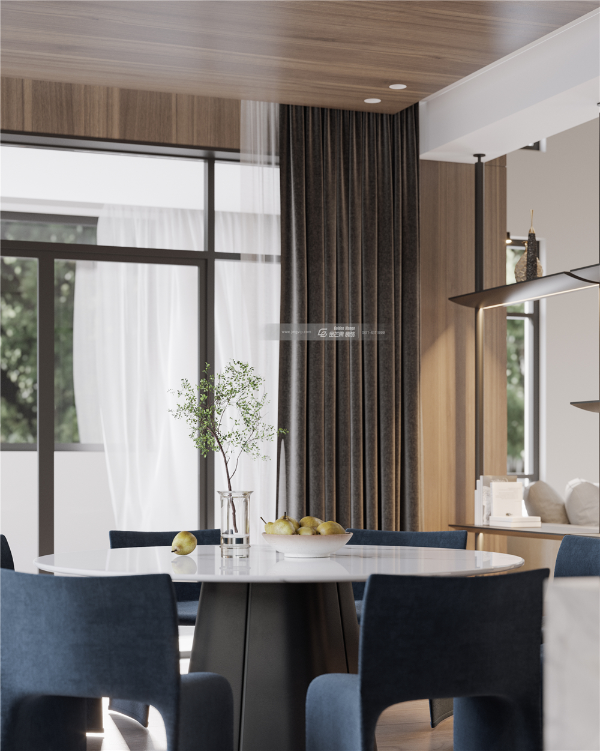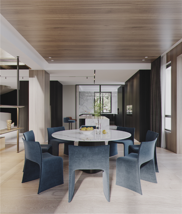 餐廳區域,桌椅采用暗色系,淡化物質存在感,注重品質的彰顯,強調精神內在的平靜與安寧。大理石餐桌臺面,更符合意式風格定義,傳達個性與時尚藝術的魅力。
