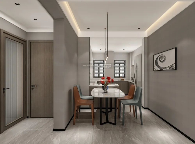 整個(gè)空間從客廳延伸到餐廳,向外無限延展,透過視線末端的墻上掛畫,空間延伸感被拉長(zhǎng),身處餐廳擁攬絕佳的視野與采光,透過形態(tài)、材料、色澤與細(xì)節(jié),蘊(yùn)藏著對(duì)簡(jiǎn)約美學(xué)的嚴(yán)謹(jǐn)思考,也無一不透露出對(duì)品質(zhì)感的嚴(yán)苛追求