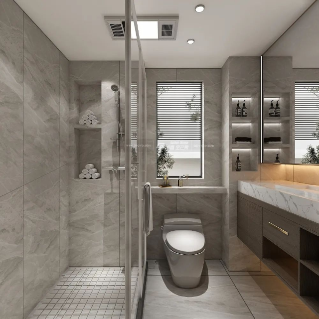 衛(wèi)生間運(yùn)用了深灰、淺灰和白色瓷磚的混搭,同時(shí)設(shè)計(jì)了長(zhǎng)鏡柜配合燈帶,整個(gè)空間層次豐富又顯得十分明凈爽潔。一家三口一天的好心情,皆從晨漱開始。