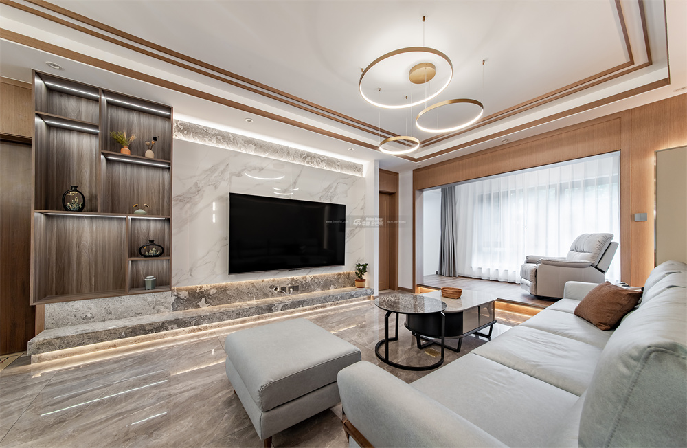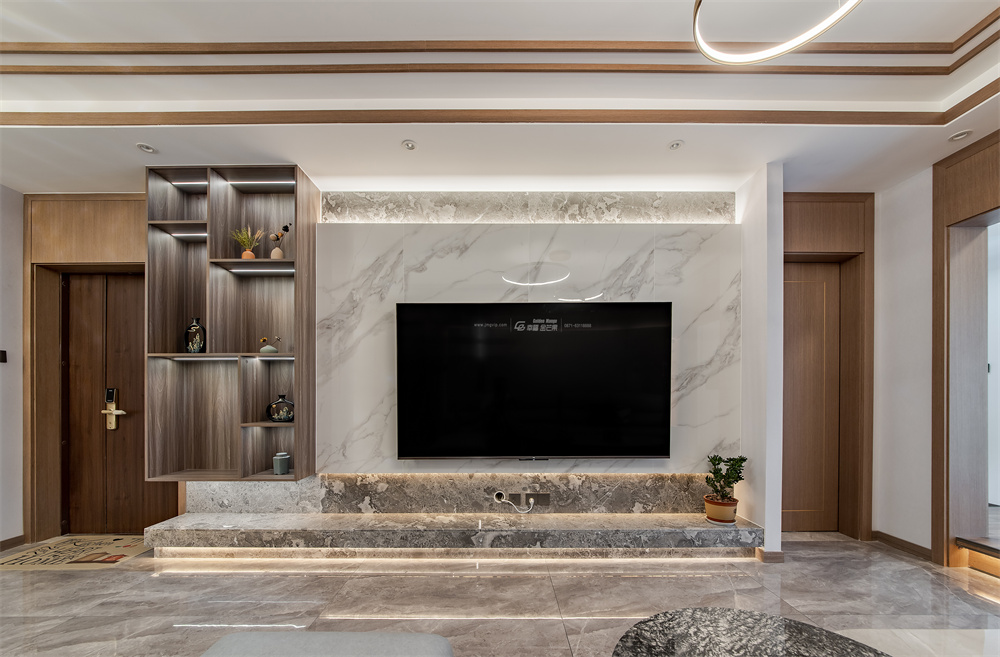 摒棄傳統(tǒng)的電視柜造型,用大理石加燈帶的處理,護墻板后安裝燈帶,相互輝映打造優(yōu)美的光影效果。是打動人心的溫暖,是別具一格的華麗。