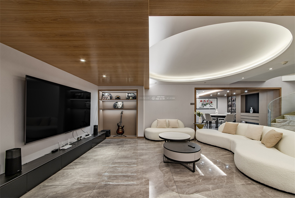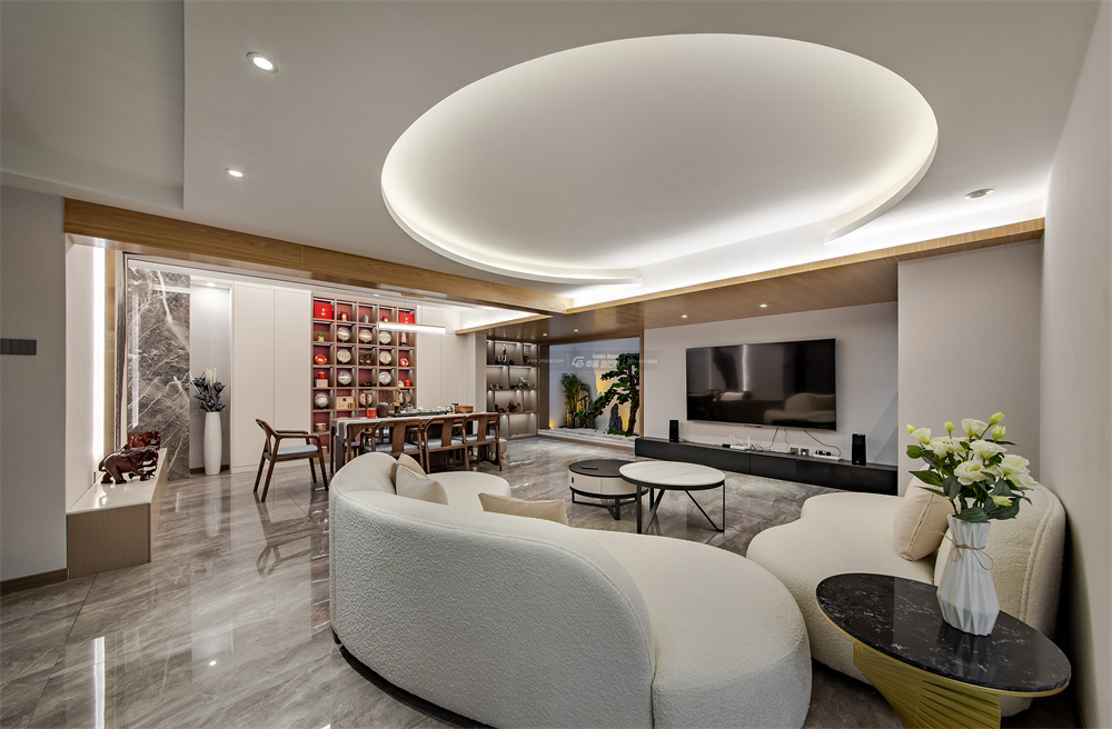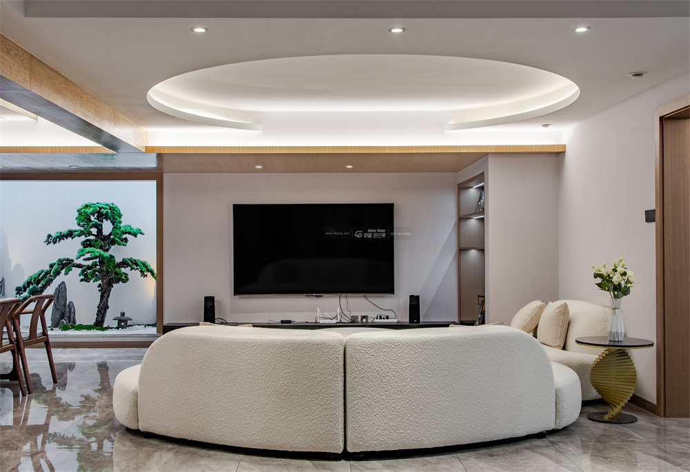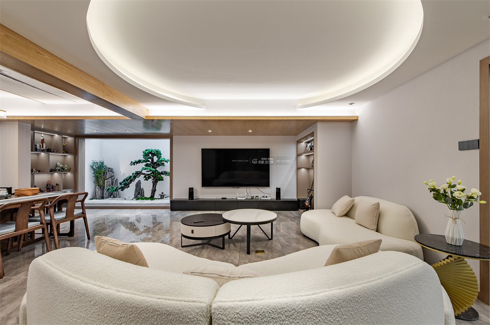 清透自在,有如山風過境,洋溢著自然的清新與生命力,視覺營造通透,擴大居者視覺感官與心境體驗。圓形的吊頂有如蒼穹,容納下萬物景觀,訴說著整個空間的靈動與自在。