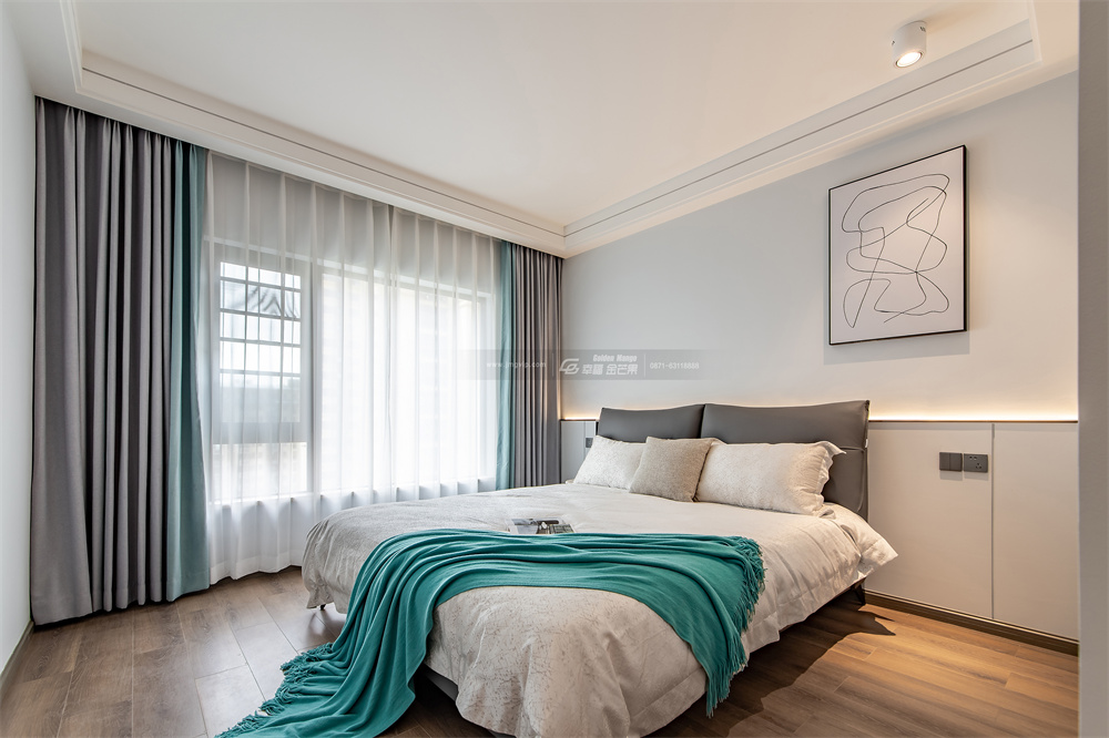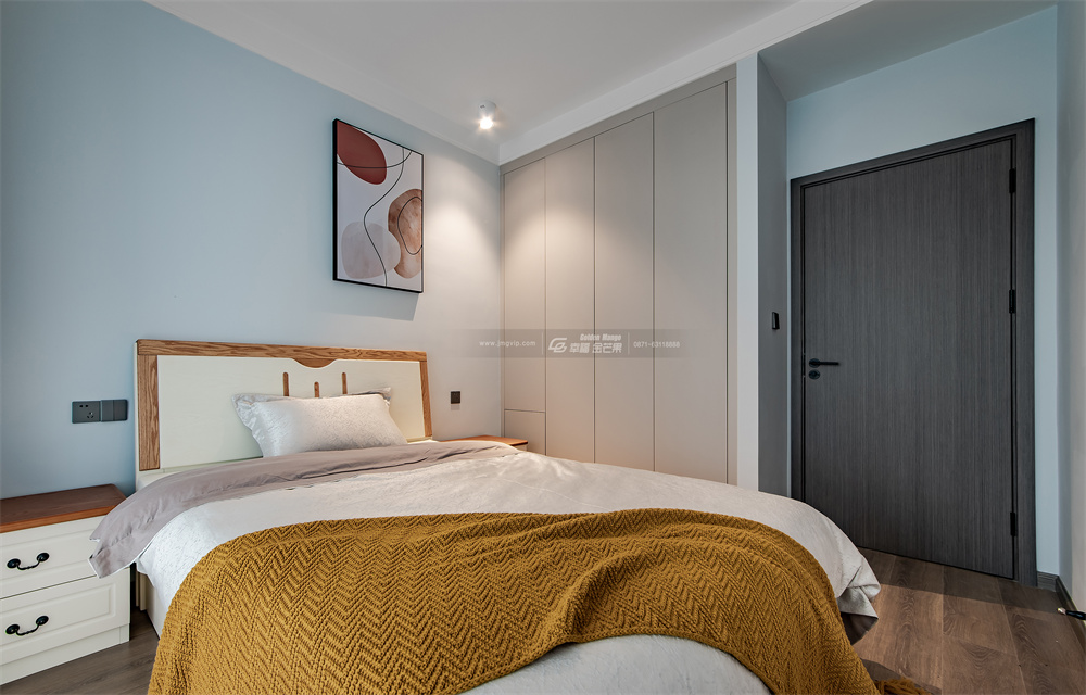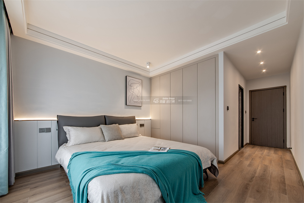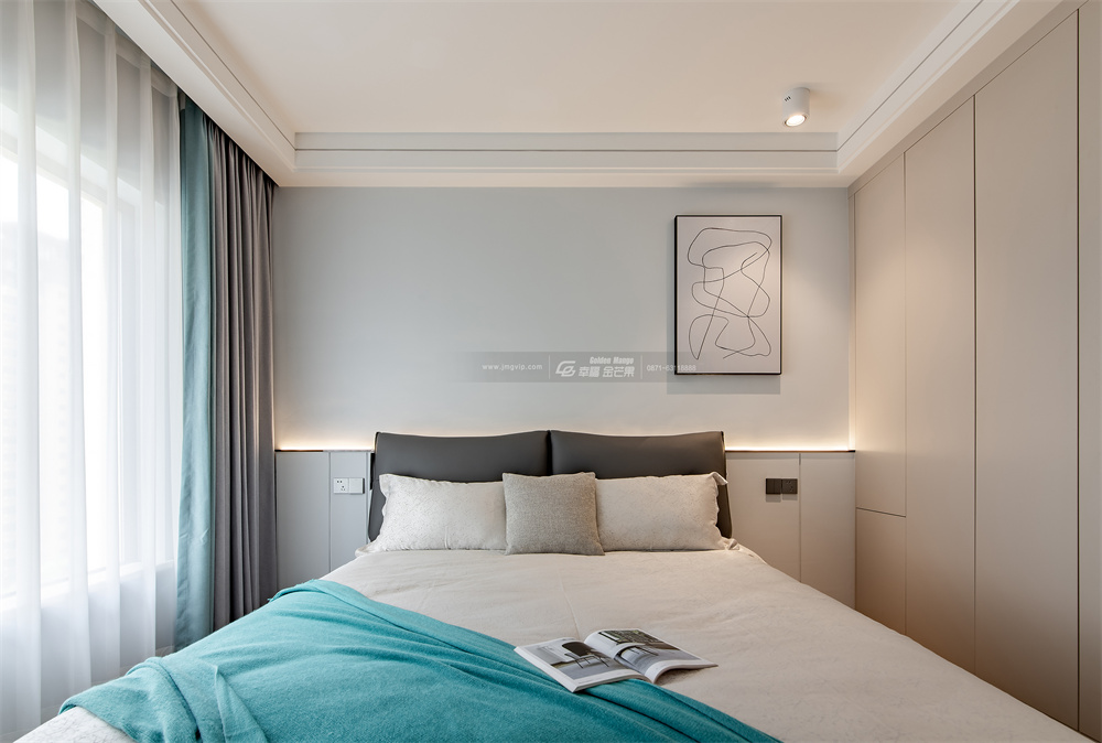 主臥以灰白為主,沒有過多的裝飾,純色乳膠漆墻面+無主燈設計,放大空間視覺感。