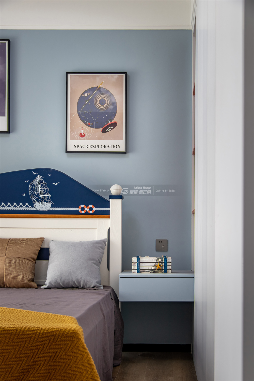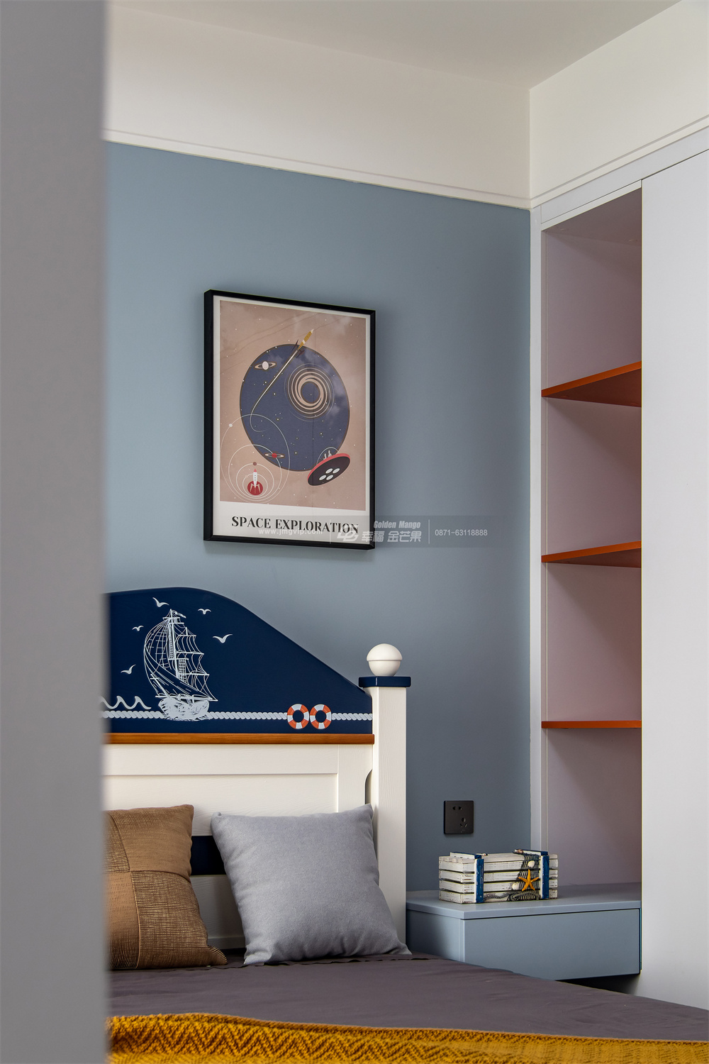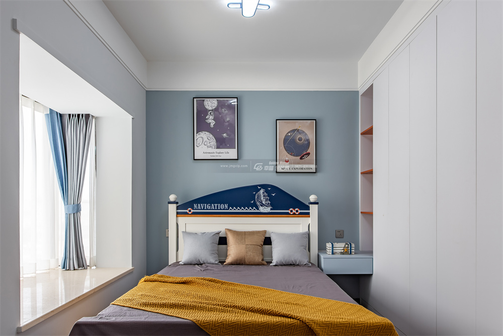孩子的世界是五顏六色的,以藍色為主色調,簡約且不失童趣。藍色床頭背景墻、宇宙星球的卡通畫、揚帆起航的床、藍色飛機燈,為空間增添了不少童真與樂趣。