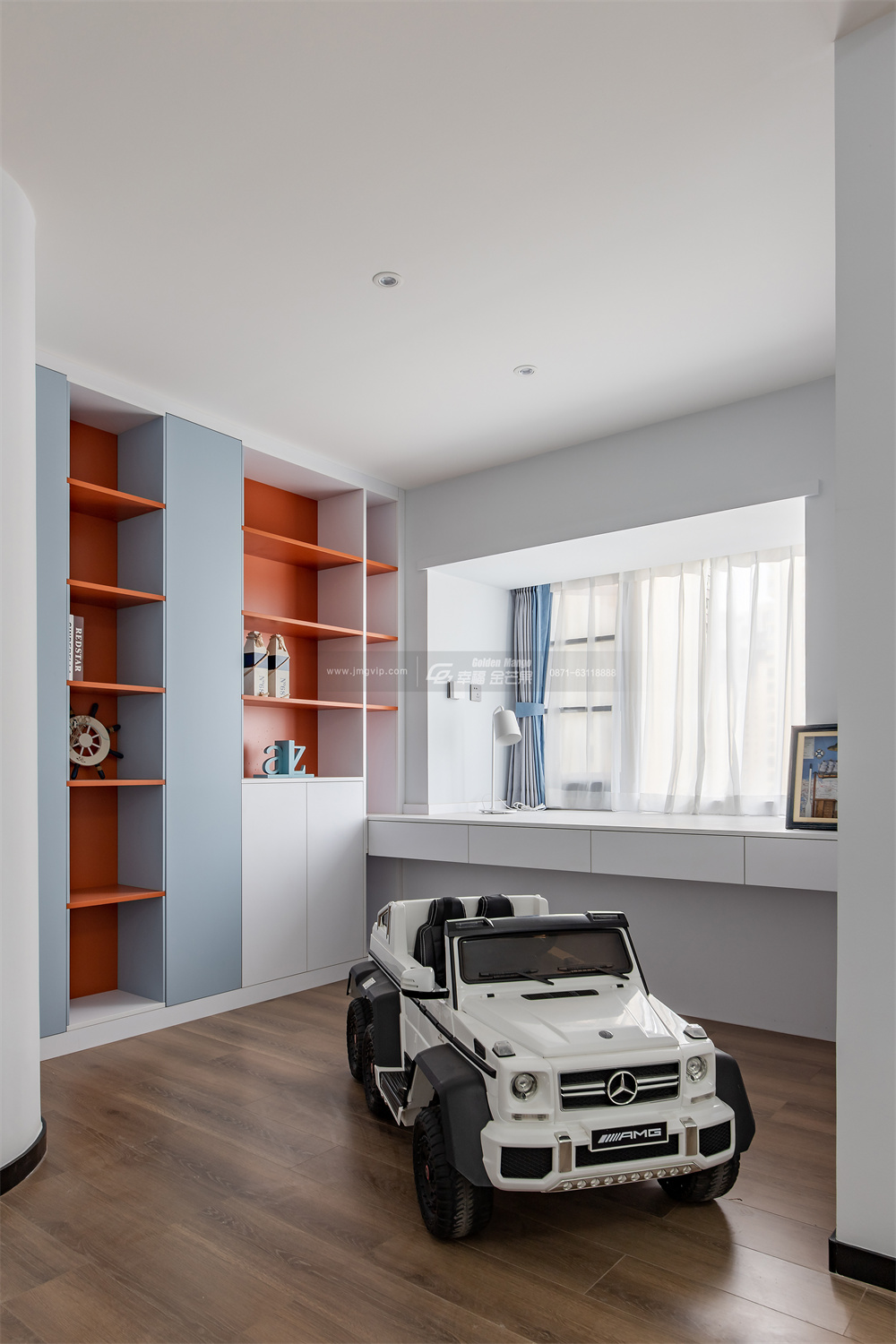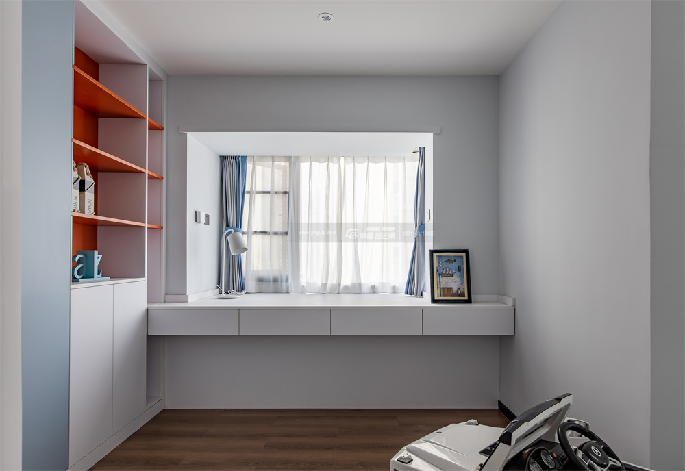 還留下大面積的休閑空間,打造了一面滿墻的儲物柜,用來收納孩子的玩具和生活用品,旁邊的飄窗臺做出延伸,改為書桌臺,打造了一片學習的天地。