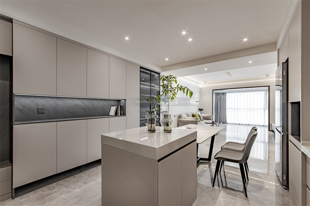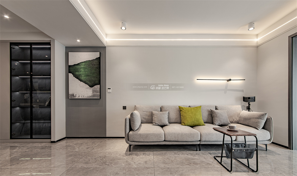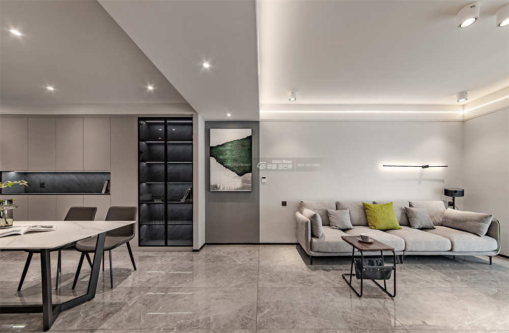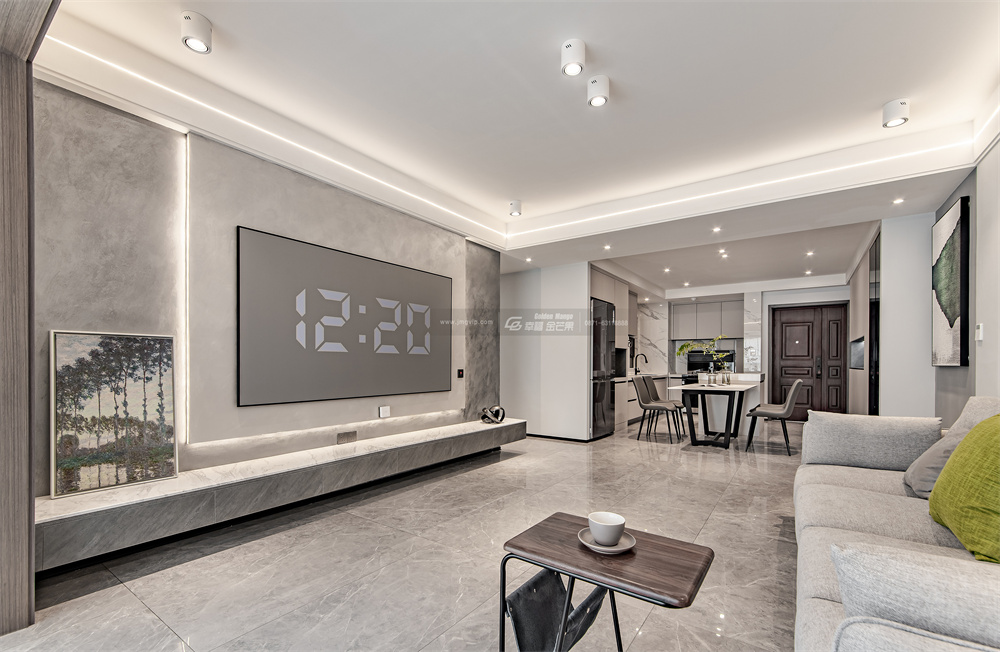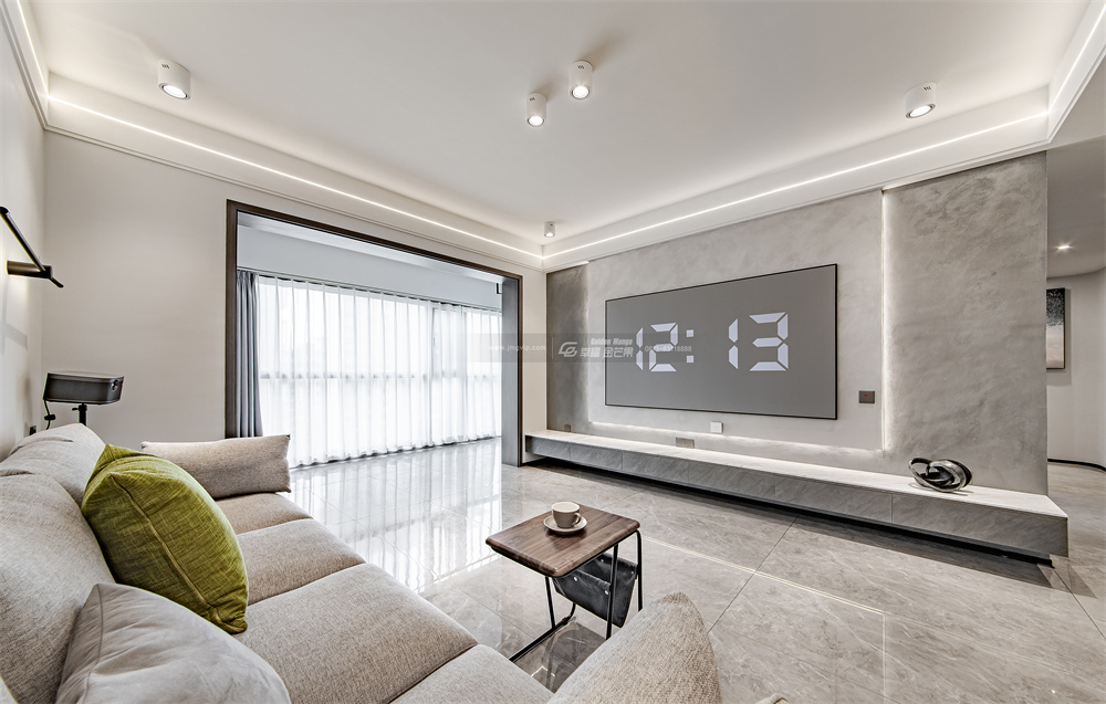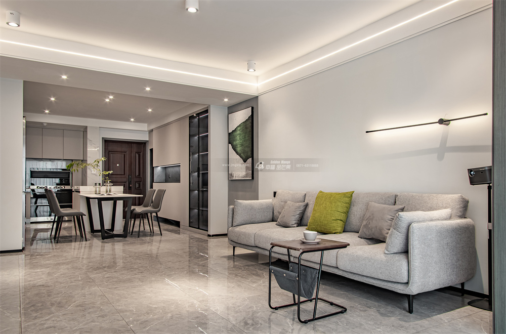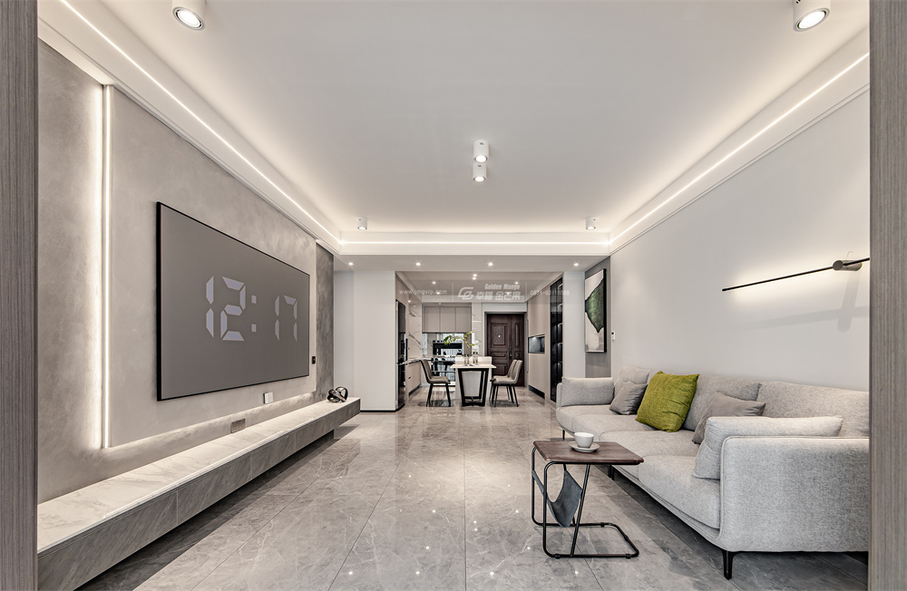 客廳以灰白色為基調,采用無主燈設計,吊頂處安裝燈帶、筒射燈,讓整體空間干凈利落,去除多余的飾品,突顯出生活的品質感。