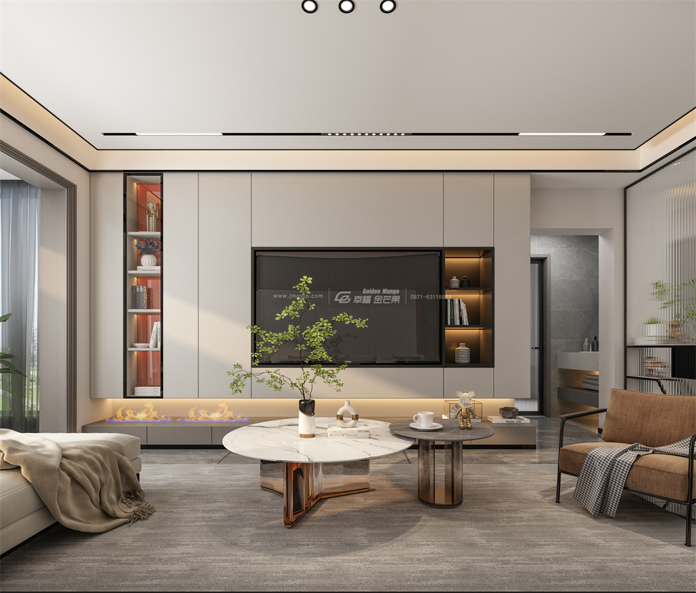 客廳充斥著滿滿的煙火氣息,溫馨而舒適。電視背景墻做嵌入式電視柜,集收納與功能性為一體。