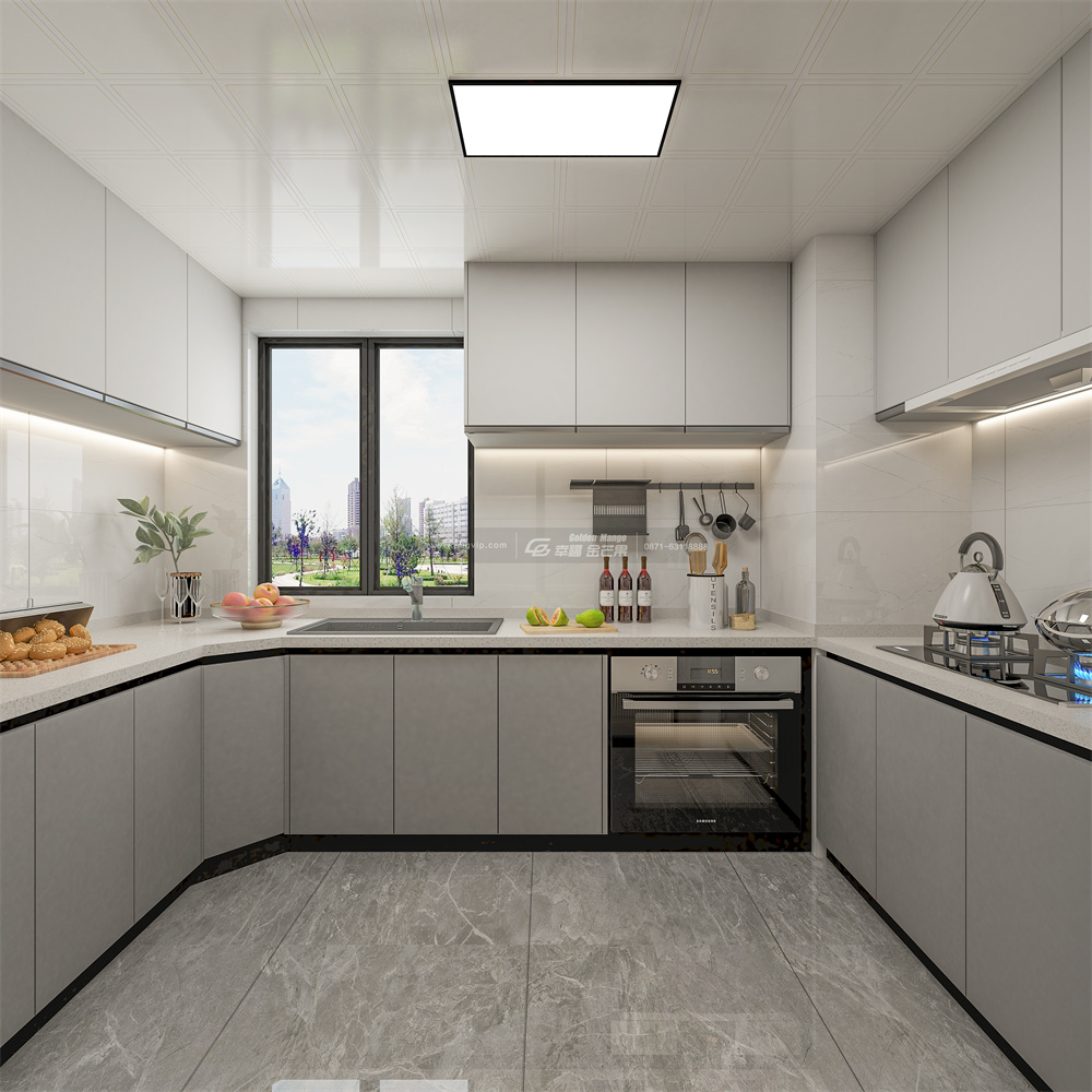 廚房以灰、白為主,地磚和柜門采用同一色系,具有良好的銜接效果。干凈的白色和穩重的灰色相搭配,顯得廚房干凈利落,現代感十足,給人以視覺上的完美感受。