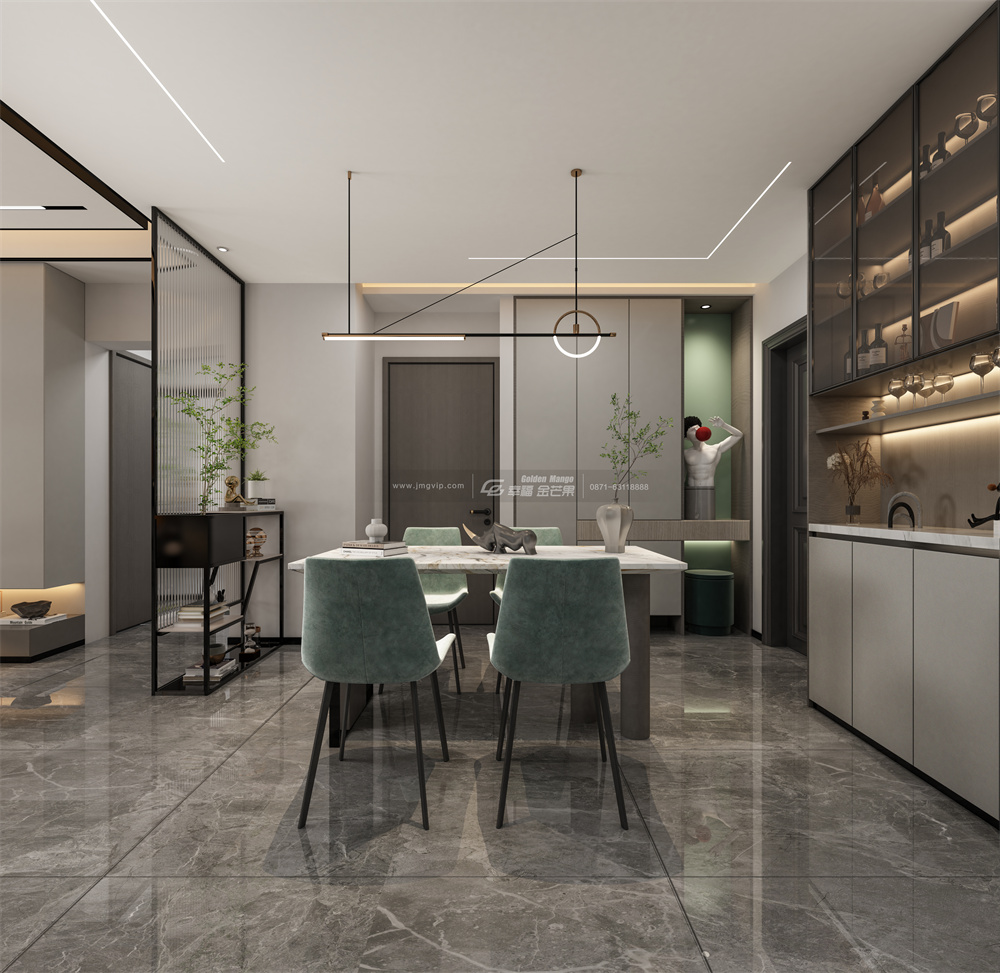 豆綠色椅子和餐廳中的綠植,避免了過于冷淡的與硬朗的視覺呈現,賦予空間一些自然和清新。