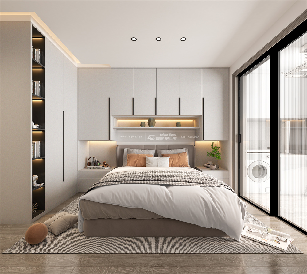 臥室采用一體化床頭設計,擴大了收納空間。床頭兩邊充當床頭柜,在開放式格子中嵌入暖光燈帶,讓空間看起來更溫馨大氣。