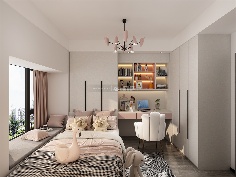 榻榻米做半屋布局,柜體書桌做一體化設計,大大提升空間利用率,并做了開放格設計,方便日常物品和精美飾品的擺放,內嵌式燈帶讓光線更柔和,讓空間顯得更溫柔。