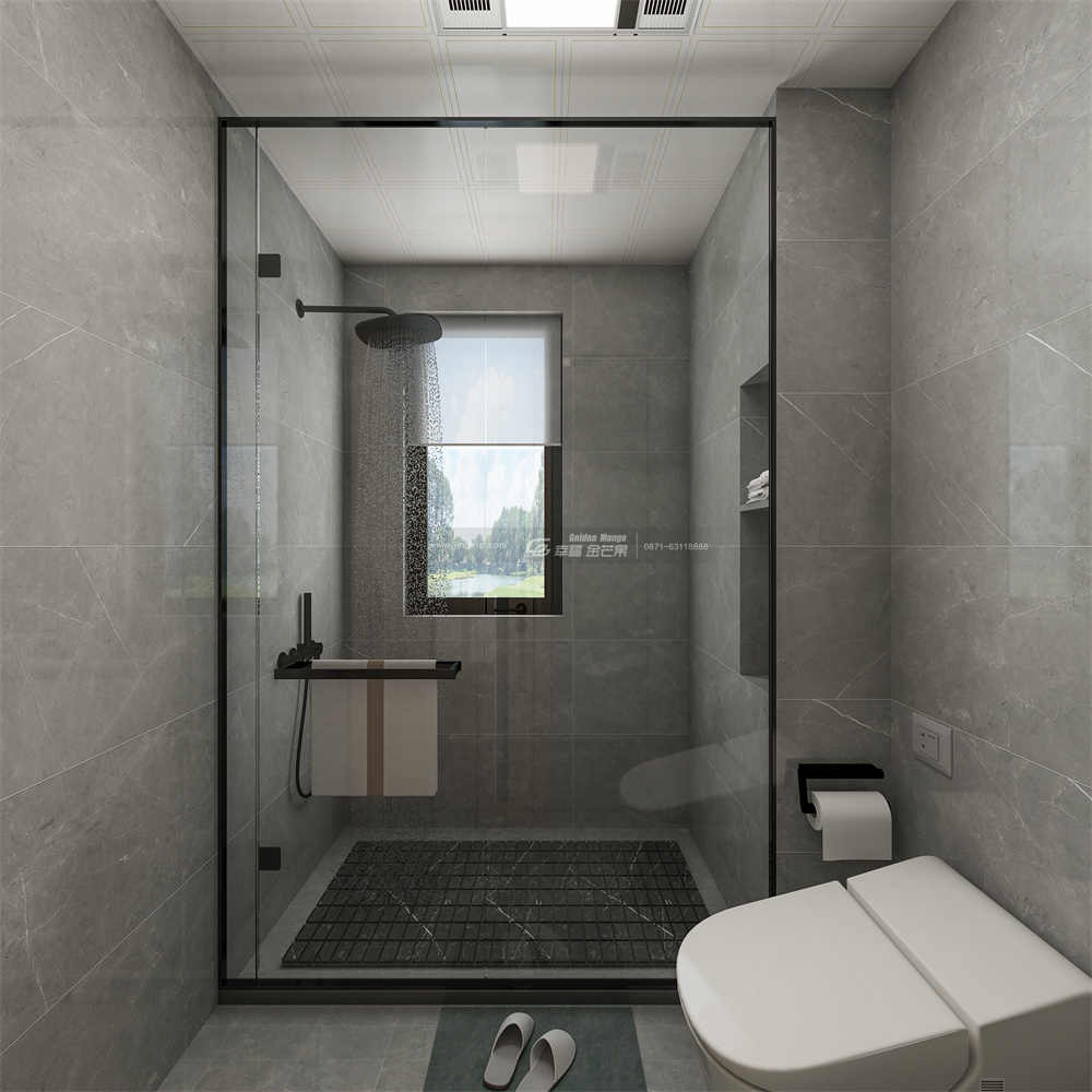 衛生間以灰色瓷磚為主,顯得整體簡約大氣又有質感。沐浴區采用玻璃隔斷做干濕分離,視覺效果很通透。