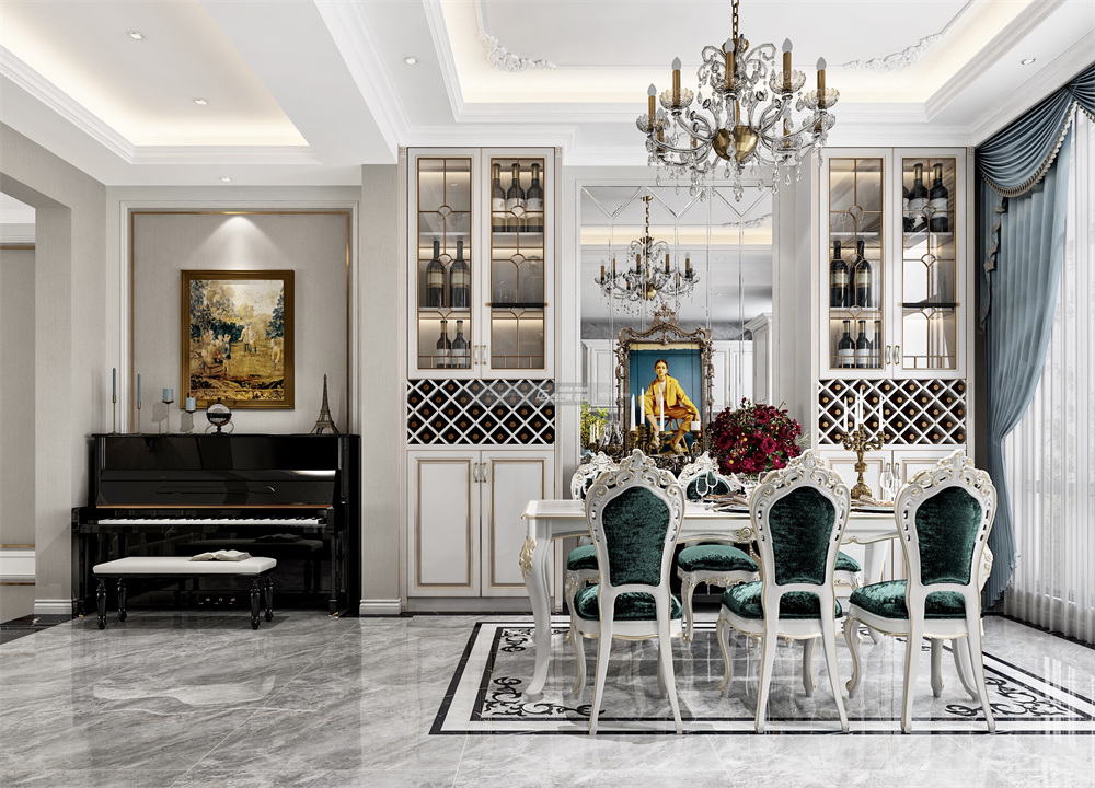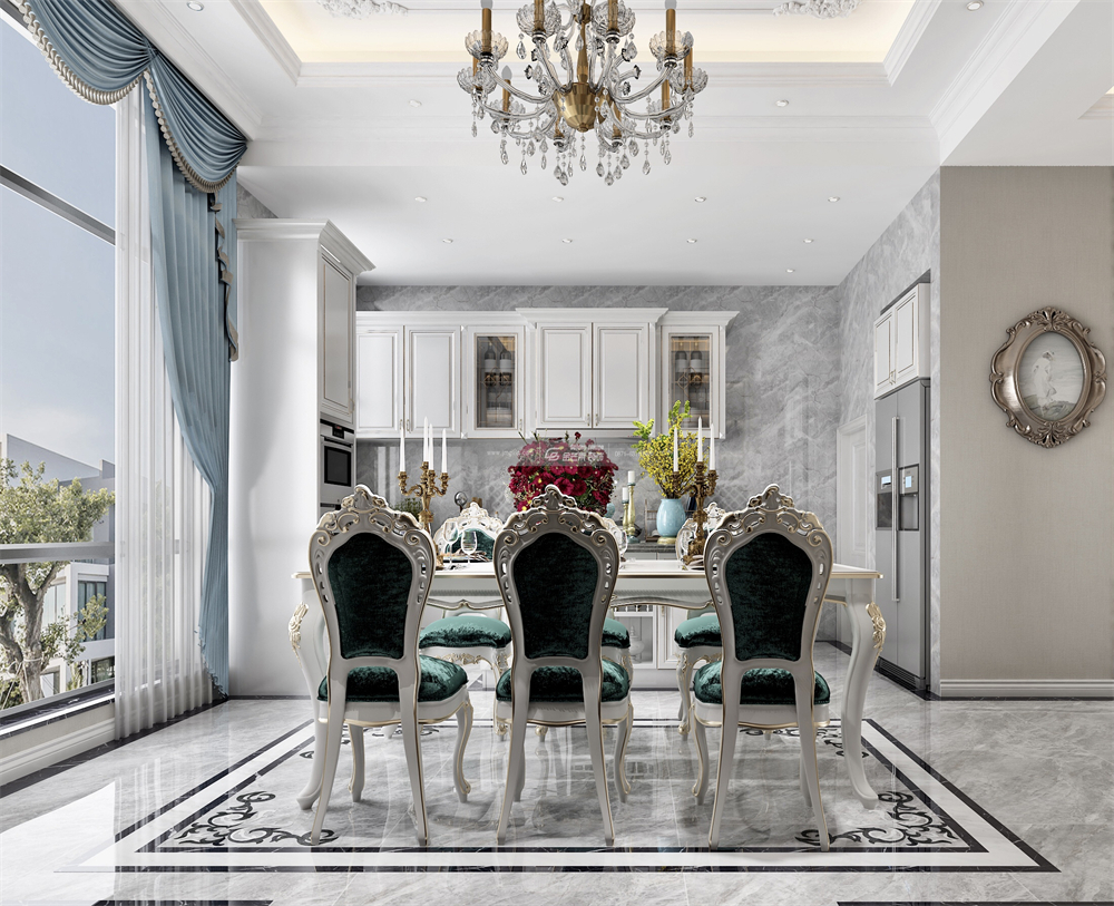 湖藍色的羅馬簾蘊含優雅氣質,使空間增添了幾分美感,同時也為空間帶來一股濃濃的藝術氣息。歐式宮廷的餐桌椅復古又經典,仿佛穿越到了古代歐洲,在這樣充滿情調的餐廳就餐,每天都是一種享受!