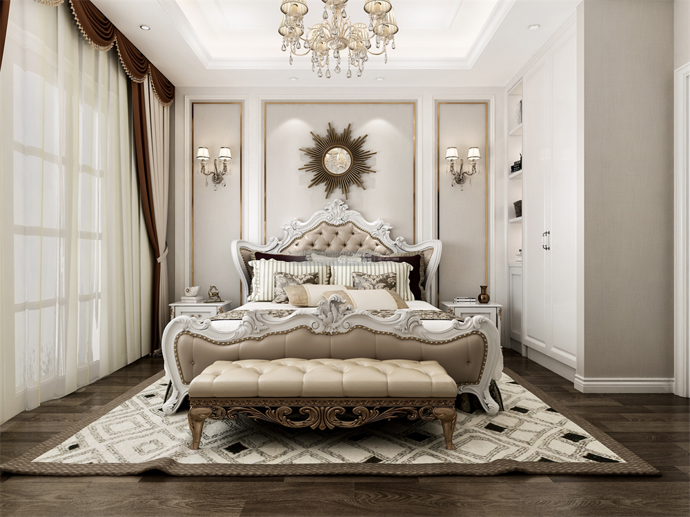 主臥以奶白色為主色調,整個空間極具奢華典雅,傳承著歐式文化底蘊的壁燈與吊燈泛著影影綽綽的燈光,朦朧、浪漫之感不由自主的散發開來,連空氣中都是溫馨的感覺!