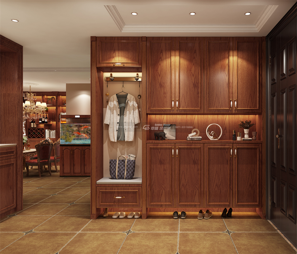 淺棕色地板與深棕色玄關柜在空間形成深淺的過渡,打造出色彩上的層次感。滿滿的復古氣息在玄關空間彌散開來。
