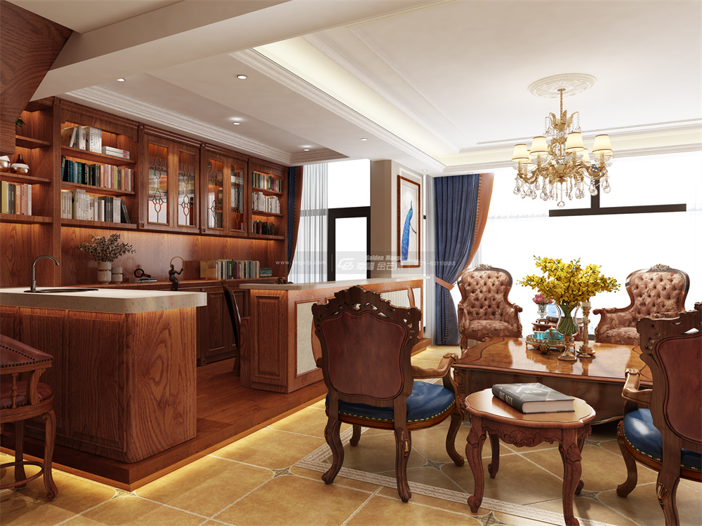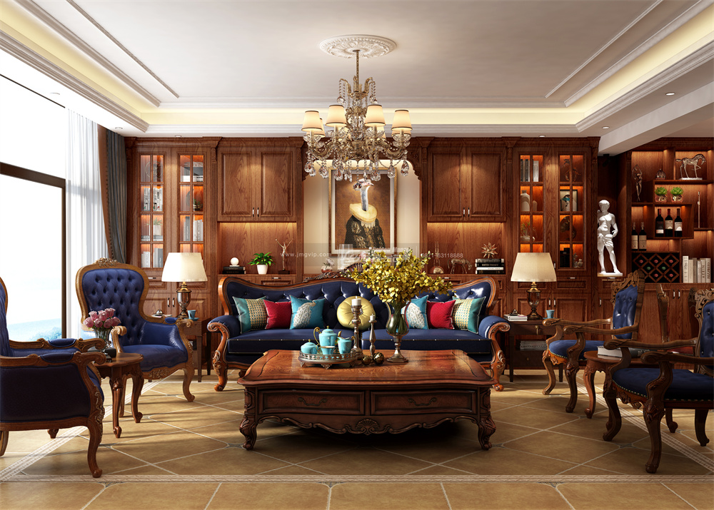 自然垂落于客廳中央的復古吊燈,烘托出空間的大氣與高級,營造出一種典雅奢華的氛圍,復古藍與深色實木家具搭配相得益彰,造型古典、做工精細、凹凸有序,讓美式的精致與復古的韻味更好的融合。