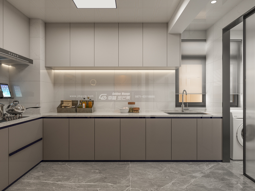 L形操作臺分區合理、廚房動線流暢,充分利用空間設置壁櫥,給廚房帶來充足的儲物收納空間,滿足空間儲物功能需求。