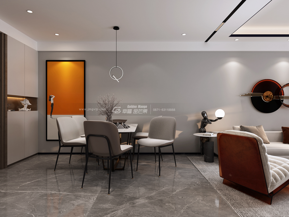 餐廳和客廳一體化設計,看似簡潔的裝飾之下,暗藏設計師的多重巧思;大理石巖板餐桌、時尚簡約餐椅、極簡吊燈與小射燈營造的氛圍以及到頂餐邊柜的有機結合,給居者更豐富的視覺盛宴和便捷的生活動線,方便居者的日常生活。
