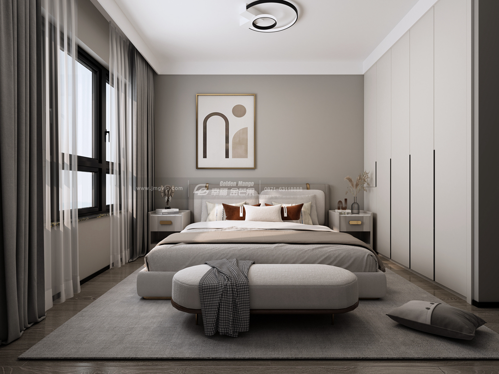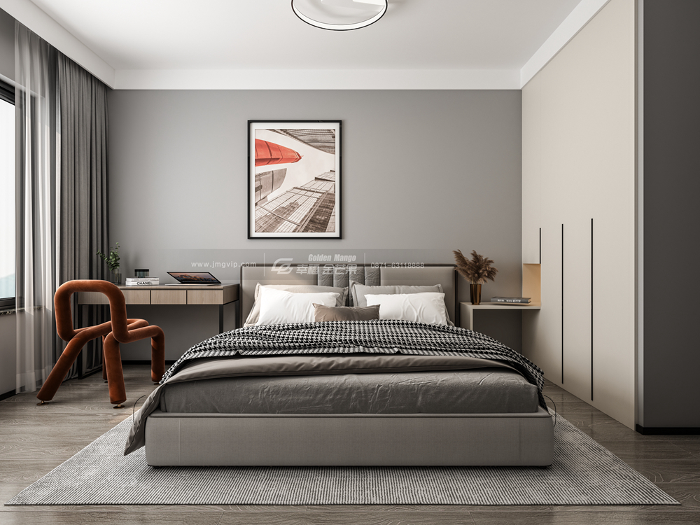 主臥整體以灰色調為主,簡化床頭柜節約出空間設置書桌,方便日常辦公又節約空間;衣柜采用封閉式一門到頂柜體,整個臥室呈現極簡主義的風格,同時也不失現代時尚的美感。