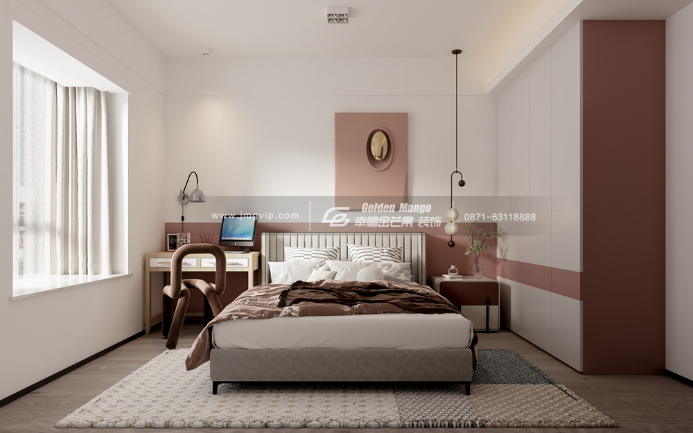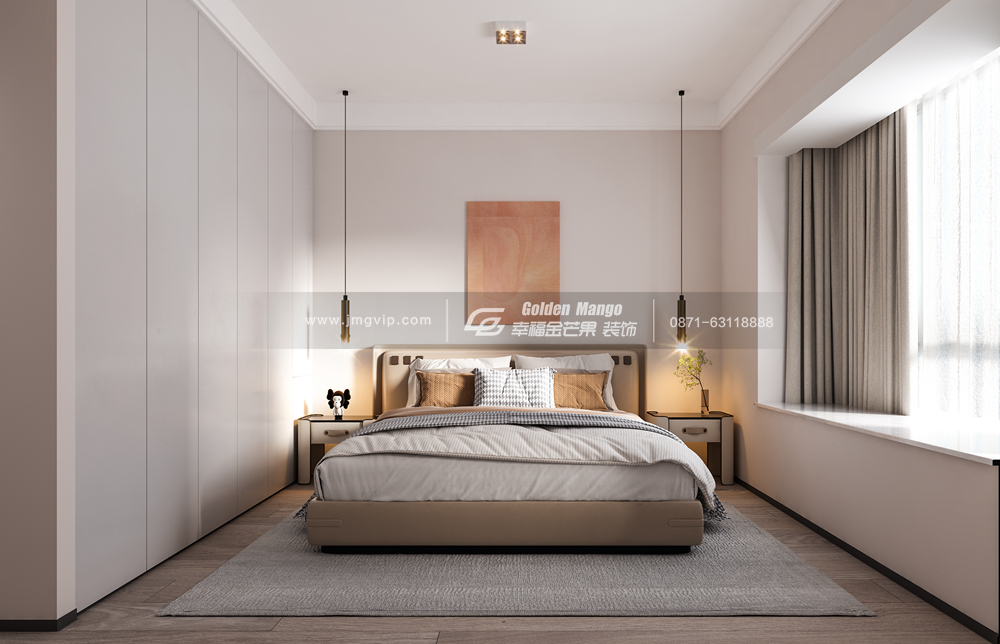 主臥放棄客廳簡灰色調帶來的冷靜、沉穩之感,選擇低飽和、有質感的白色、玫瑰棕等色調偏,營造臥室柔軟舒適的質感,色調淡雅,造型簡潔,很好的展示出現代風格的簡約時尚。