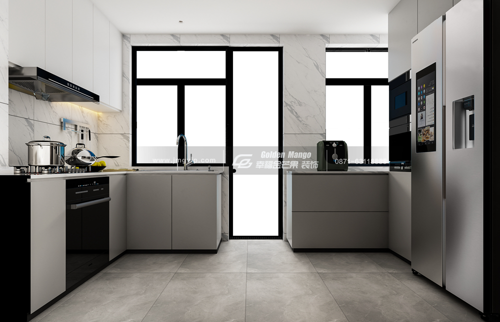 廚房通鋪白色大理石做操作臺面,搭配黑色和白色的柜體,整體明亮通透又整潔;U型廚房設計,有效利用空間,符合烹飪需求,廚房與小陽臺相連,玻璃門窗框起的就是家的味道。