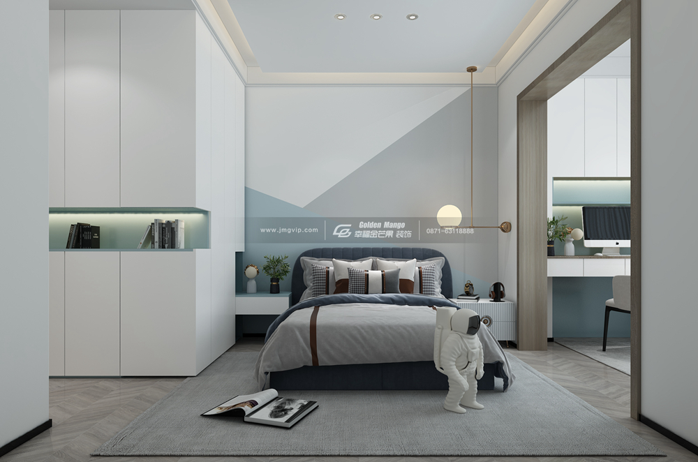 次臥色調偏向輕快簡約的藍白色調,原木色的門框連接次臥陽臺的簡單書房空間,也許夜幕降臨,萬物歸于沉靜之時,陽臺的燈還會亮著,那是居者對于家記憶里的一個名為“向上”的篇章。